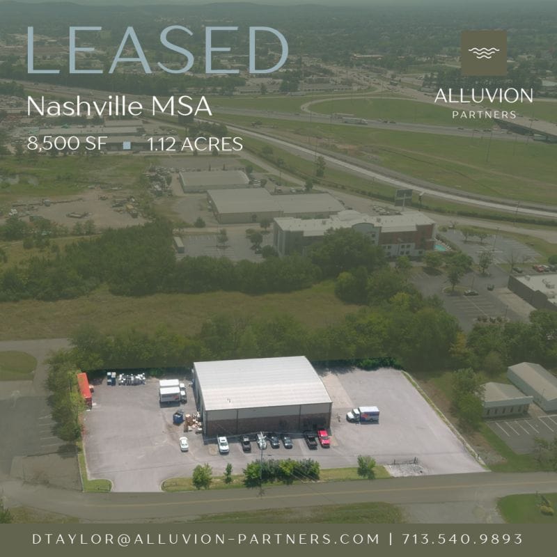LEASED: Alluvion Partners leased a recently acquired 1.12-acre industrial outdoor storage property in the Nashville MSA, totaling 8,500 SF. The site will be occupied by The Greathouse Company, a Nashville-based landscaping and outdoor services provider, reflecting continued demand from service-oriented tenants for small-format IOS sites.