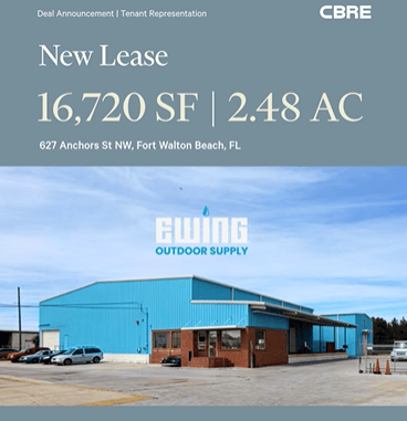 LEASED: Ewing Outdoor Supply signed a 16,720 SF lease in Fort Walton Beach, FL, securing a 2.48-acre site with ample outdoor storage and a fully secured yard. The transaction was led by Kevin Calihan and Anton Grigoriou, supporting Ewing’s continued expansion across the Florida panhandle.
