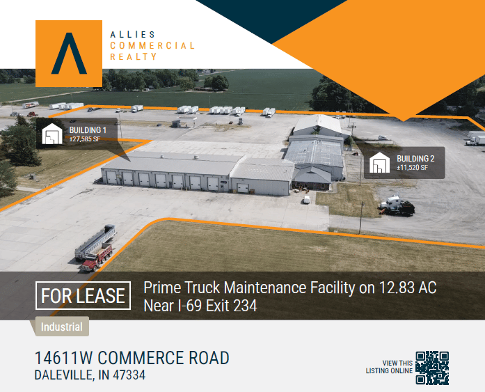 FOR LEASE: This 12.83-acre truck maintenance facility in Daleville, IN offers two large buildings totaling nearly 43,000 SF with excellent highway access just off I-69. The site is fully paved with ample outdoor storage and a large pylon sign along SR-67, making it ideal for transportation, maintenance, or fleet users. With commercial zoning and strong visibility, the property provides a functional, move-in-ready solution for operators needing scale and accessibility. Reach out to Adam Stephenson and Mitchell Ayers for more info.