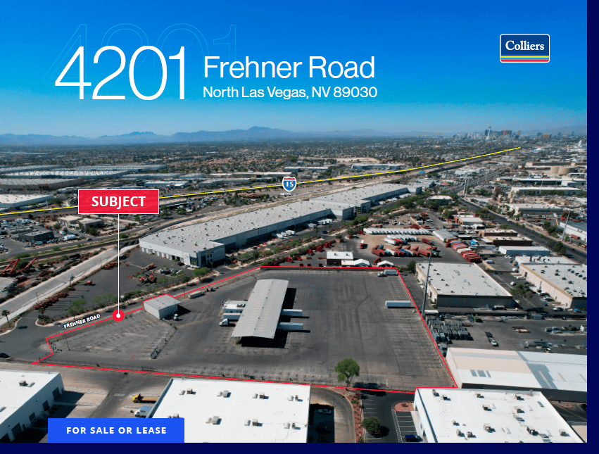 FOR SALE OR LEASE: This ±5.98-acre freight terminal site in North Las Vegas offers an 18,250 SF terminal, a 2,300 SF warehouse, and 1,850 SF of office space, all less than five minutes from the I-15. The property features 48 dock-high loading positions, an above-ground fueling island, a fully secured yard with 7,000V fencing, and IL zoning suited for transportation and logistics users. With excellent access to the Las Vegas Strip, Harry Reid International Airport, and major freight corridors, the site is well positioned for both owner-users and tenants seeking a functional, high-capacity terminal location. Reach out to Zach McClenahan and Jerry Doty for more info.