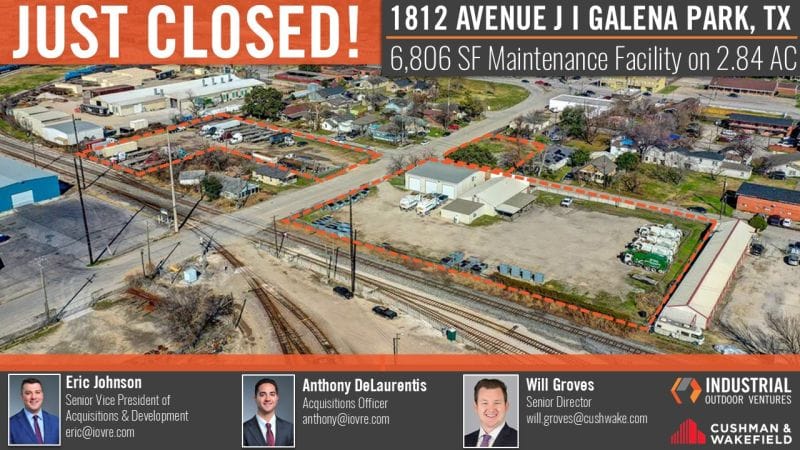 ACQUISITION: IOV acquired a 6,806 SF equipment maintenance facility on 2.84 acres in Galena Park, TX, spanning three parcels with strong industrial zoning and functionality. The property includes a 16' clear building, three oversized drive-in doors, and 1,000 SF of office space, making it well-suited for fleet, service, and maintenance users. Now being marketed for lease, the site offers high-quality improvements and excellent usability for operators seeking well-located IOS space near Houston’s core industrial markets.