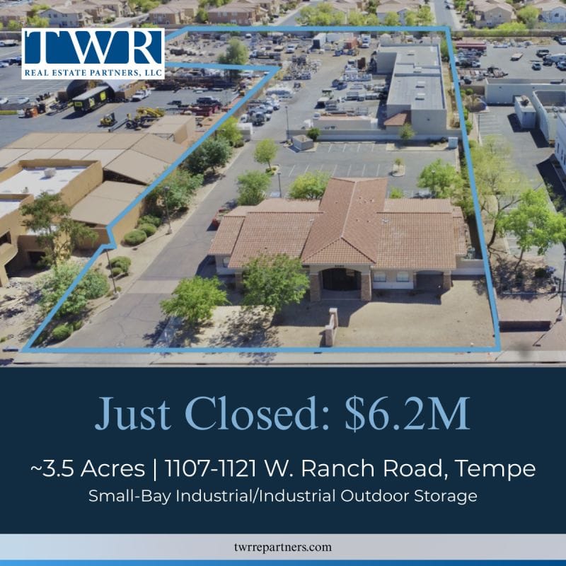 ACQUISITION: TWR Real Estate Partners has acquired a 16,900 SF facility with a 2-acre storage yard in Tempe, AZ for $6.2M. The ±3.5-acre property includes seven grade-level doors, a truck well, remodeled office space, ample parking, and a fully fenced yard with an automatic gate—ideal for manufacturing, logistics, or service-based users. Located minutes from I-10, the 202, and Phoenix Sky Harbor International Airport, the site benefits from Tempe’s strong industrial demand and central connectivity.