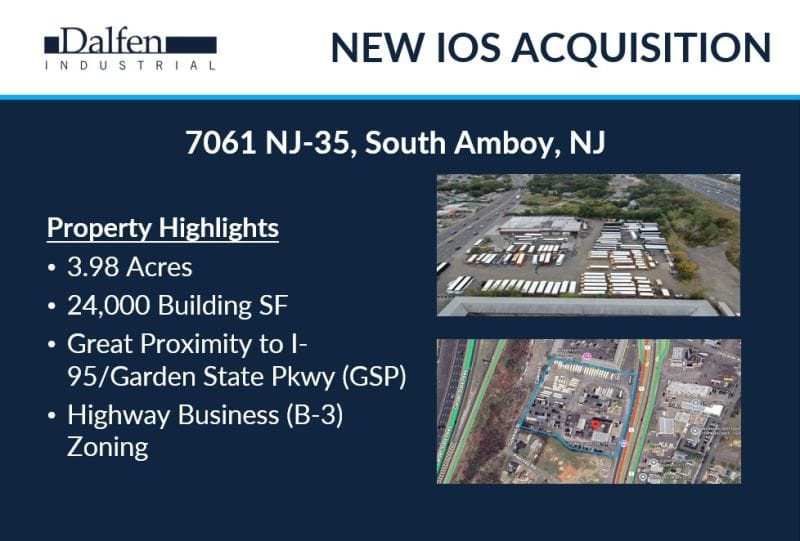 ACQUISITION: Dalfen Industrial acquired an IOS property at 7061 NJ-35 in South Amboy, NJ. The 3.98-acre site includes a 24,000-SF facility and is zoned Highway Business (B-3), allowing a wide range of industrial outdoor storage uses. The property offers excellent access to I-95 and the Garden State Parkway, strengthening Dalfen’s IOS footprint in the New Jersey market.