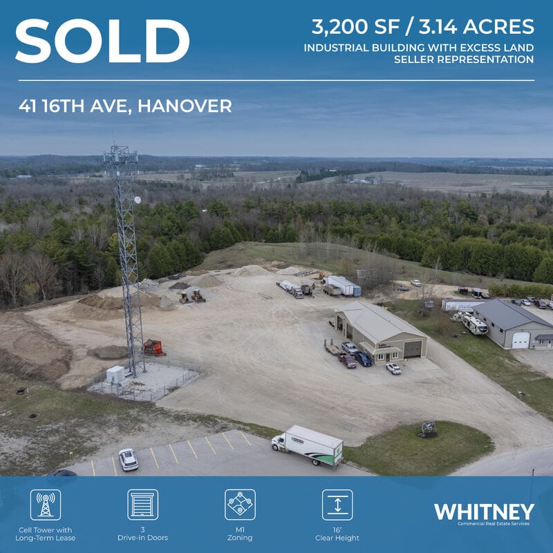 ACQUISITION: An industrial property at 41 16th Avenue in Hanover sold, featuring a 3,200-SF building on 3.14 acres within Hanover’s Industrial Park. The site includes ample outdoor storage, oversized drive-in doors, and a cell tower with a long-term lease in place. The seller was represented by Xavier Ayora, Rich Evanoff, SIOR, and Jessica McFarlane.