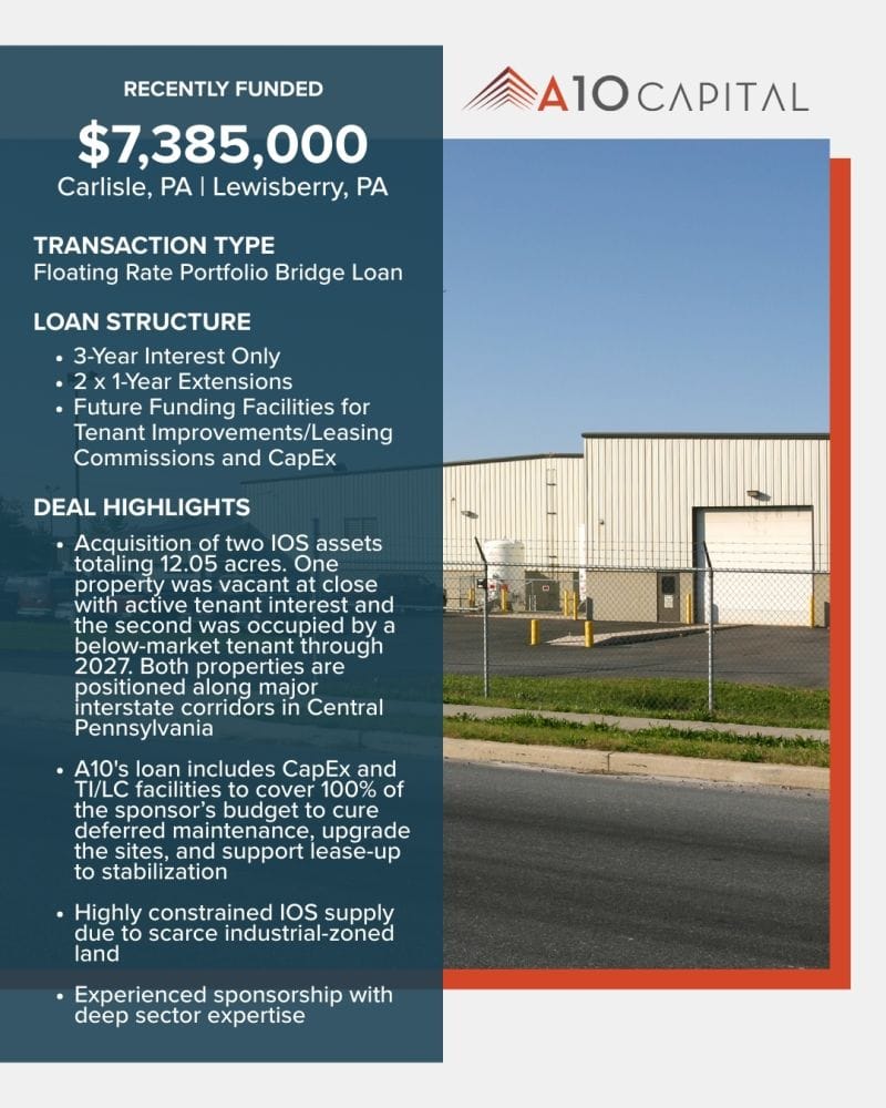 FINANCING: A10 Capital closed a $7.385M floating-rate portfolio bridge loan to finance the acquisition of two Industrial Outdoor Storage properties in the Central PA market. The loan covers two IOS assets totaling 12.05 acres and includes future funding for tenant improvements, leasing commissions, and capex, supporting stabilization of the portfolio.