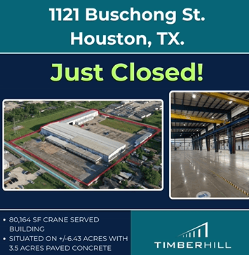 ACQUISITION: An 80,164-SF crane-served industrial facility at 1121 Buschong Street in Houston, TX was acquired by Timber Hill. The 6.43-acre property includes 3.4 acres of concrete outdoor storage, full perimeter fencing, grade-level drive-through access, overhead cranes, and a fully climate-controlled building with 30’ eaves.