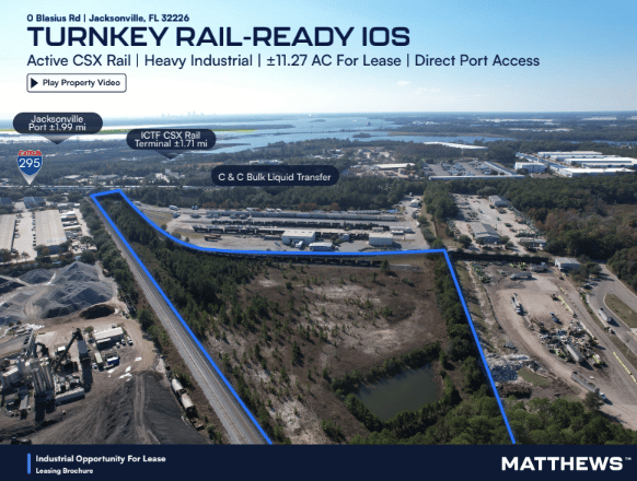 FOR LEASE: The site sits on Blasius Road directly along the CSX main line and includes two active on-site rail spurs totaling roughly 1,500 linear feet, with nightly switching already in place. Spanning approximately 11 acres and zoned Heavy Industrial (IH), the stabilized open yard is suited for transload, bulk materials, manufacturing, and import/export users, with lease terms up to 30 years at $0.85–$0.95 PSF NNN. Its location near JAXPORT, I-295, CSX intermodal facilities, and Jacksonville International Airport offers rare, immediate access to rail, truck, and port infrastructure. Reach out to Mike Salik for more info and see aerial footage here.