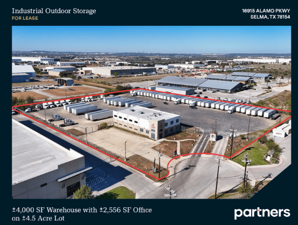 FOR LEASE: This 4.5-acre industrial outdoor storage site in Selma, TX features a ±4,000 SF warehouse and ±2,556 SF two-story office with direct access to I-35 and the broader San Antonio industrial corridor. The property offers concrete truck courts, dock-high and grade-level loading, and extensive trailer and equipment parking across a fully paved and fenced yard. Built in 1990, the site is well-suited for logistics, fleet, construction, or service-oriented users needing infill IOS with office support. Reach out to Stan Nowak, Andrew Alizzi, and Colten Courtney for more info.