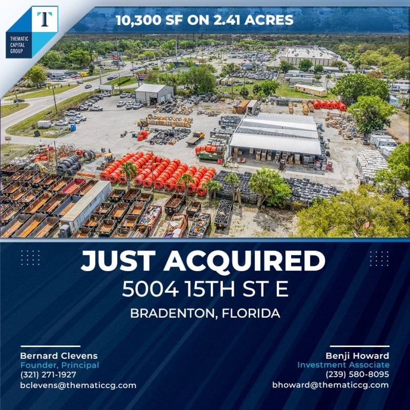 ACQUISITION: Thematic Capital Group acquired a 2.41-acre IOS site at 5004 15th St E in Bradenton, FL, featuring a 10,300 SF warehouse and a highly functional outdoor storage yard. The property is fully occupied by Lambert’s Cable Splicing Co., supporting essential utility infrastructure and reinforcing the site’s long-term usability. This acquisition highlights continued demand for infill IOS assets with strong tenancy in supply-constrained Florida markets sourced by Max Loria and David Richman.