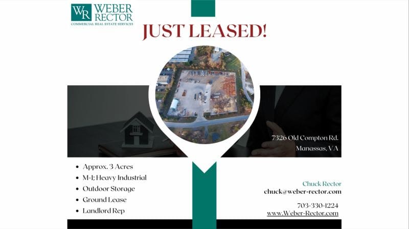LEASED: Weber Rector Commercial Real Estate Services just leased an approximately 3-acre M-1 Heavy Industrial outdoor storage site at 7236 Old Compton Rd. in Manassas, VA. The transaction was completed as a ground lease, with Chuck Rector representing the landlord.