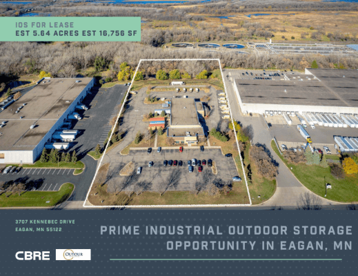 CBRE is offering a prime 5.64-acre IOS and industrial facility for lease at 3707 Kennebec Drive in Eagan, MN. The property includes 16,756 SF across office and shop/warehouse space, featuring 8 drive-in doors, 4 drive-through maintenance bays, a wash bay, heavy 480V 3-phase power, and roughly 60 truck plug-ins. The fully fenced, paved, and lit yard supports truck-oriented operations, with the owner open to expanding the usable outdoor storage area.