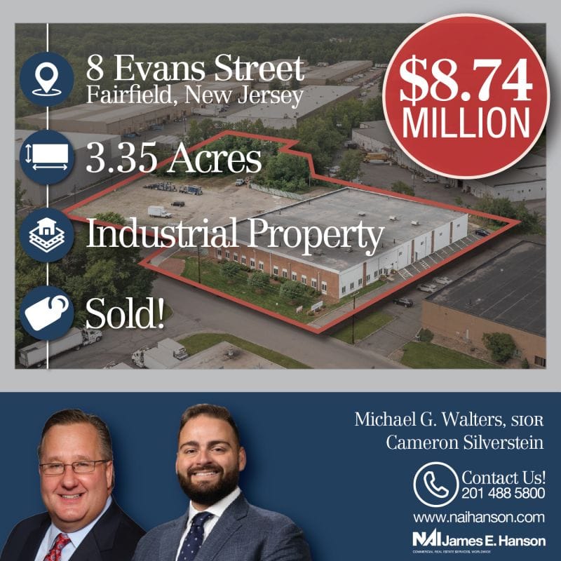 ACQUISITION: NAI James E. Hanson has closed the $8.74 million sale of a 3.35-acre industrial property with outdoor storage at 8 Evans Street in Fairfield, NJ. The transaction highlights strong owner-user demand for well-located, high-utility IOS and industrial assets. Michael Walters and Cameron Silverstein negotiated the deal.