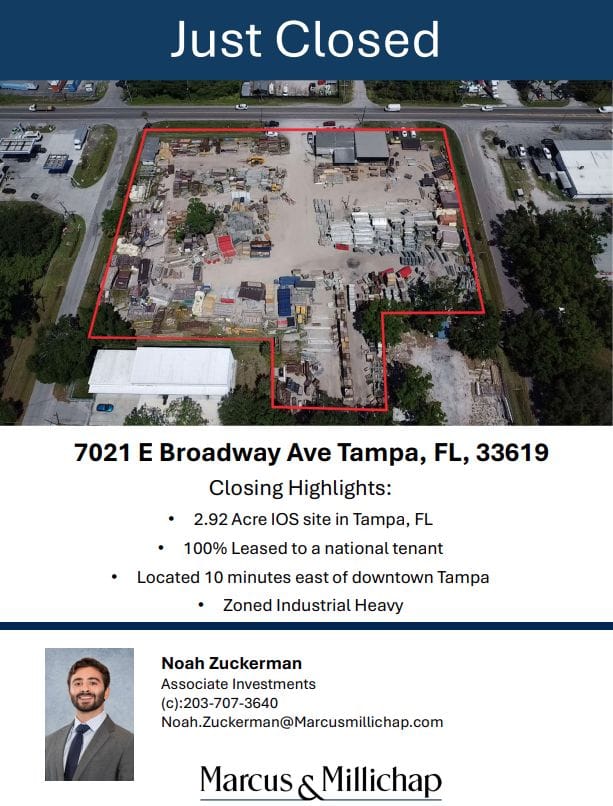 ACQUISITION: Marcus & Millichap has closed the sale of a 2.92-acre IOS site at 7021 E Broadway Ave in Tampa, FL. The property is 100% leased to a national tenant and is located just 10 minutes east of downtown in an Industrial Heavy zoning district. Congrats to Noah Zuckerman on facilitating this one.