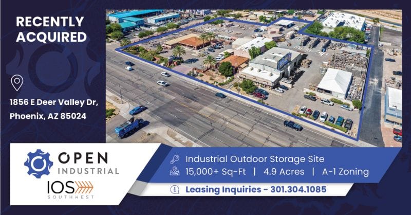 ACQUISITION: Open Industrial has acquired 1856 E Deer Valley Drive in Phoenix, AZ, a 4.93-acre IOS property with over 15,000 SF of combined office and warehouse space. The site includes a secure paved laydown yard and sits within the Deer Valley submarket near the TSMC fabrication plant.