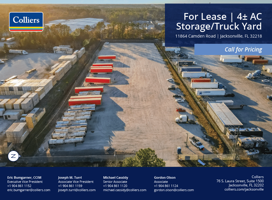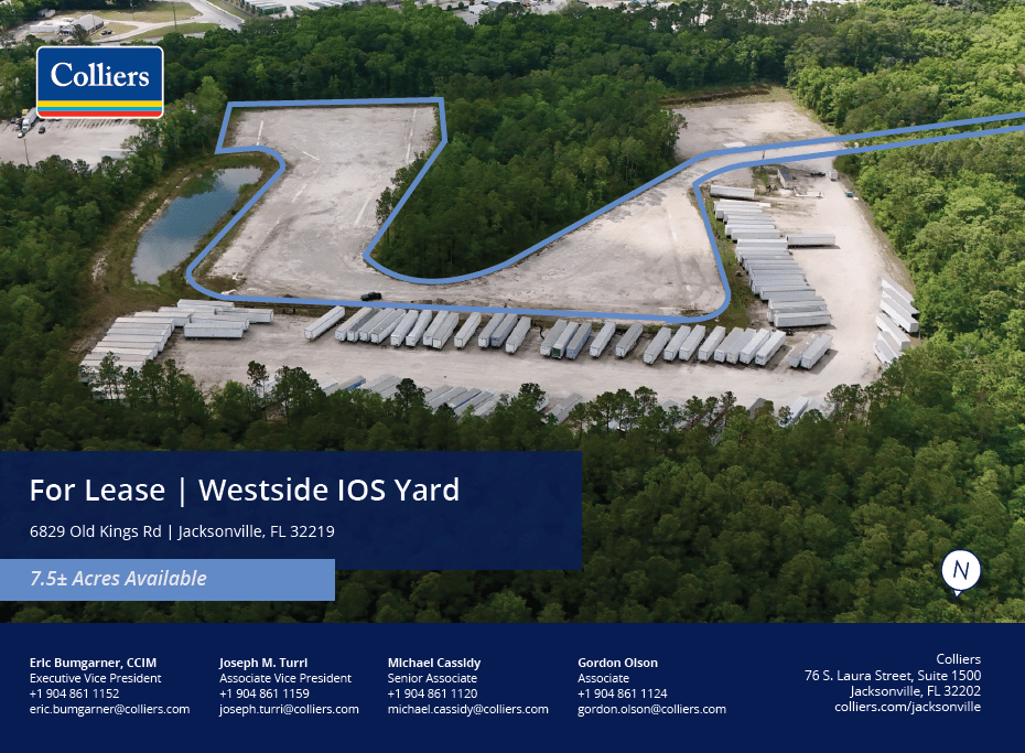 This 4.5± acre industrial and commercial outdoor storage site offers exceptional connectivity to JAXPORT, the Dames Point Marine Terminal, and I-295, making it one of the most strategically positioned yards in Jacksonville’s Northside submarket. The site is fully secured with perimeter fencing, gated access, pole lighting, reefer plugs, and a crushed-rock surface, plus a 1,200 SF on-site office trailer. With zoning for Industrial Waterfront (IW), the property supports marine, logistics, transportation, and industrial storage uses aligned with the region’s growing port-driven demand.