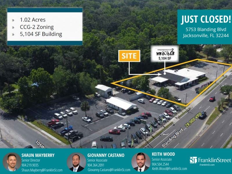 ACQUISITION: 5753 Blanding Blvd, Jacksonville, FL 32244 was recently sold! Prime Blanding Blvd frontage with 28,000+ VPD, 1.02 Acres, and 5,104 SF Freestanding Building.