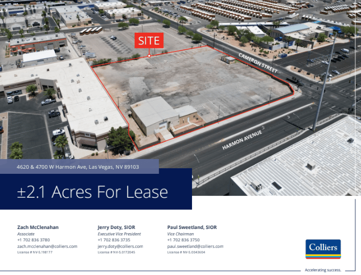 FOR LEASE: ±2.1 acres available for lease at 4620 & 4700 W Harmon Ave, Las Vegas, NV. The property features ±3,661 SF of building space with Industrial Light (I-L) zoning, offering direct access to I-15 North and South in the Southwest submarket, and is available immediately at a negotiable NNN lease rate. Built in 1997 with metal construction, the site includes a septic system, paved and lit secure lot, and a chain-link fence perimeter with a rolling gate.