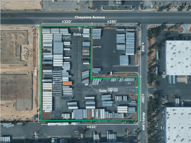 FOR LEASE: Located at 3125 Abels Lane, Las Vegas, NV 89115, this Prologis drop lot and trailer/container yard offers ±6.52 acres for lease in the North Las Vegas submarket, built in 2004 and zoned Industrial Light (IL). The fully fenced and lighted yard features 195 trailer stalls plus 44 smaller trailer stalls, with two entrances accessible from both East Cheyenne Avenue and Abels Lane. The property provides convenient access to I-15 via the Cheyenne Avenue Interchange and is situated just east of Lamb Boulevard and south of Cheyenne Avenue.