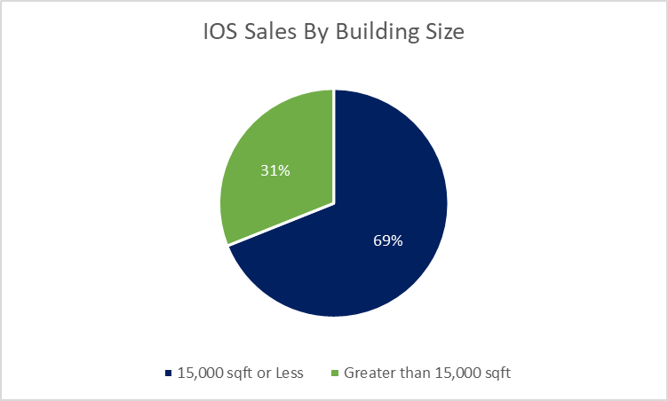 The median sale site size in 2025 was 3.6 acres, with ~70% of all IOS sales tracked from 2023 to 2025 featuring buildings of 15k square feet or less.