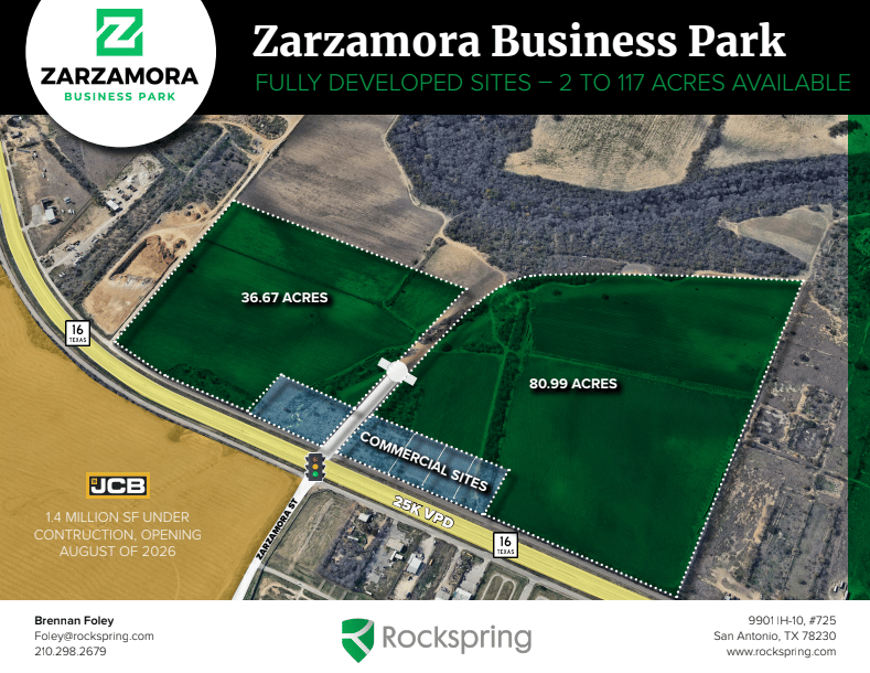 Located at the signalized intersection of Kelly Parkway and Zarzamora Blvd along Highway 16, Zarzamora Business Park offers up to 117 acres of fully developed industrial land, divisible to suit. Utilities are in place (SAWS water and sewer, CPS electric), and the site is zoned I-1, allowing for Industrial Outdoor Storage (IOS) uses. With 25,100 vehicles per day, direct access to Loop 410, I-35, and US-281, and proximity to major manufacturers like JCB, Toyota, and Navistar, the park is ideal for suppliers, logistics operators, and industrial users seeking scalable land positions with excellent visibility and infrastructure.