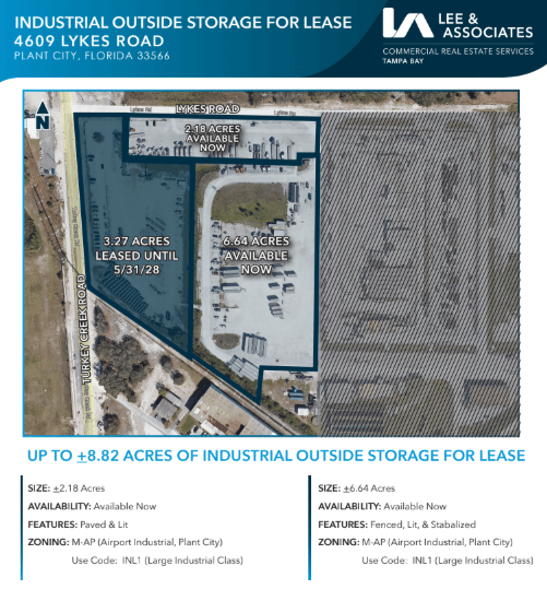 Up to 8.82 acres of fenced, lit, and stabilized IOS space are available for lease in Plant City across multiple yard sizes. The site offers M-AP zoning with immediate availability along Lykes Road.