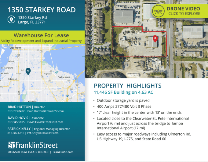 This Sarasota site totals 11.8 acres across four buildings (±24,367 SF + ±8,000 SF configurations) with 18–20 ft clear heights, nine grade-level doors, and three points of ingress/egress. Zoned Light Manufacturing, it offers flexible warehouse and yard layouts suitable for contractors, equipment users, and industrial outdoor operations, and is available immediately. Check out the full listing here.