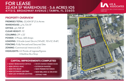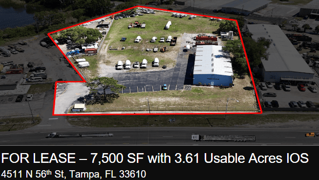 This East Tampa industrial site offers a 7,500 SF building (with 1,000 SF office) plus 3.81 acres of fenced outdoor storage, featuring multiple grade-level doors, 22' clear height, and heavy power. With M-Manufacturing zoning and direct access to major highways and the Port, it’s a turnkey IOS yard ideal for trucking, equipment, and service-oriented users. Check out the full listing here.