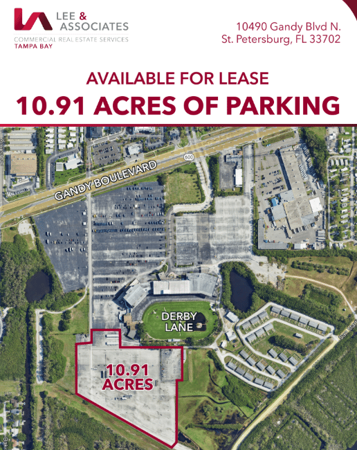 The site offers 10.91 acres of paved parking directly off Gandy Boulevard in St. Petersburg, adjacent to the Derby Lane property. Its size and location make it well-suited for fleet parking, vehicle storage, or large-scale outdoor operations.
