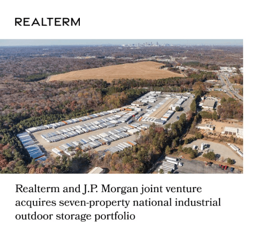 ACQUISITION: Realterm, in partnership with institutional investors advised by J.P. Morgan Asset Management, acquired a seven-property national industrial outdoor storage (IOS) portfolio across key U.S. transportation markets. The portfolio includes six truck terminals and one truck fleet maintenance facility, expanding Realterm’s footprint and strengthening its leadership in transportation real estate. The acquisition enhances the company’s ability to serve evolving logistics needs while deepening relationships with tenants and partners.
