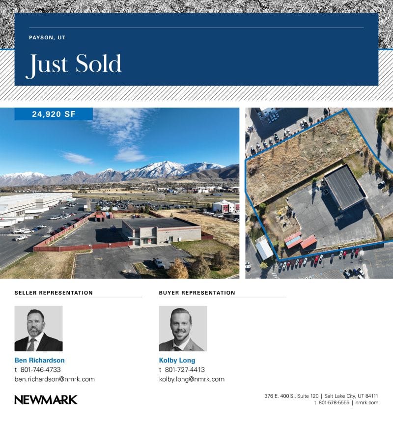 DISPOSITION: 649 Innovation Way, Payson, UT recently sold. This off-market deal came together quickly, closing in 60 days after the seller brought it forward. Ben Richardson represented the seller and Kolby Long represented the buyer.